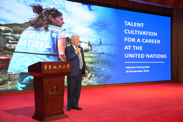 法布里齐奥・霍克希尔德先生作题为“联合国人才培养及其当前的挑战”(“Talent cultivation for the United Nations and its current challenges”)的主旨发言指出,在现行组织框架和运行机制下,联合国正面临着一系列挑战:联合国安理会常任理事国的意见存在分歧,导致俄乌、加沙等地区的和平方案推进受阻;联合国大会决议多为“软法”性质的建议,难以在恢复地区和平中发挥更加显著的作用。他同时强调虽然联合国的有关工作面临着现实困境,但联合国在维系国际秩序、维持国际和平与安全方面仍发挥着不可替代的重要作用。他还介绍了从事联合国工作的职业发展前景,并建议中国学生重视提升英语沟通和辩论能力,以及加强对国际事务的认知。