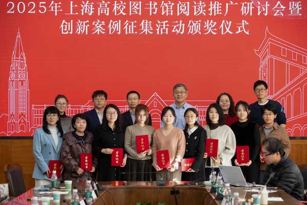 会议还举行了“2025年上海高校图书馆阅读推广创新案例征集活动”颁奖仪式,对在阅读推广工作中涌现出的优秀案例进行了表彰,具体包括书香校园建设、阅读资源优化、阅读素养培育、科技赋能阅读、阅读成果展示转化五个类别27个优秀创新案例,以及12个会议优秀分享案例,其中我校“书香沪韵典耀中华”365读书日活动探索、图书馆“奇妙夜”开启阅读新体验等案例获得新华社、学习强国等国家级媒体报道,充分展示了上海高校图书馆界在阅读推广领域的创新活力与丰硕成果。