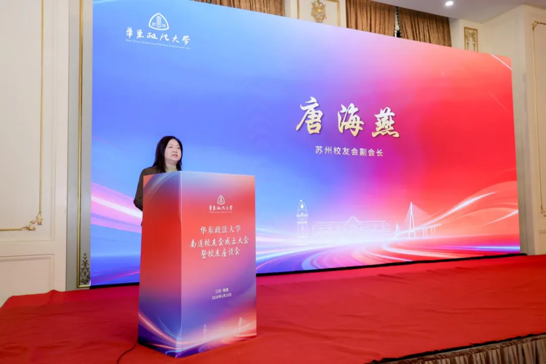 江苏校友会代表马国强、苏州校友会唐海燕先后致辞,对南通校友会的成立表示热烈祝贺,并期待未来加强校友组织互动,共同为长三角一体化发展注入华政智慧与法治力量。