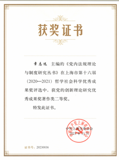 该系列第二批由五本著作组成,《党内法规通识读本》《党的组织法规原理》《党的领导法规原理》《党的自身建设法规原理》《党的监督保障法规原理》以“1+4”的党内法规体系基本框架,按照“规范主体、规范行为、规范监督”相统筹相协调的原则对党内法规体系进行深入剖析,为党内法规体系的不断完善提供智识资源。该系列丛书荣获上海市第十六届哲学社会科学优秀成果奖二等奖。