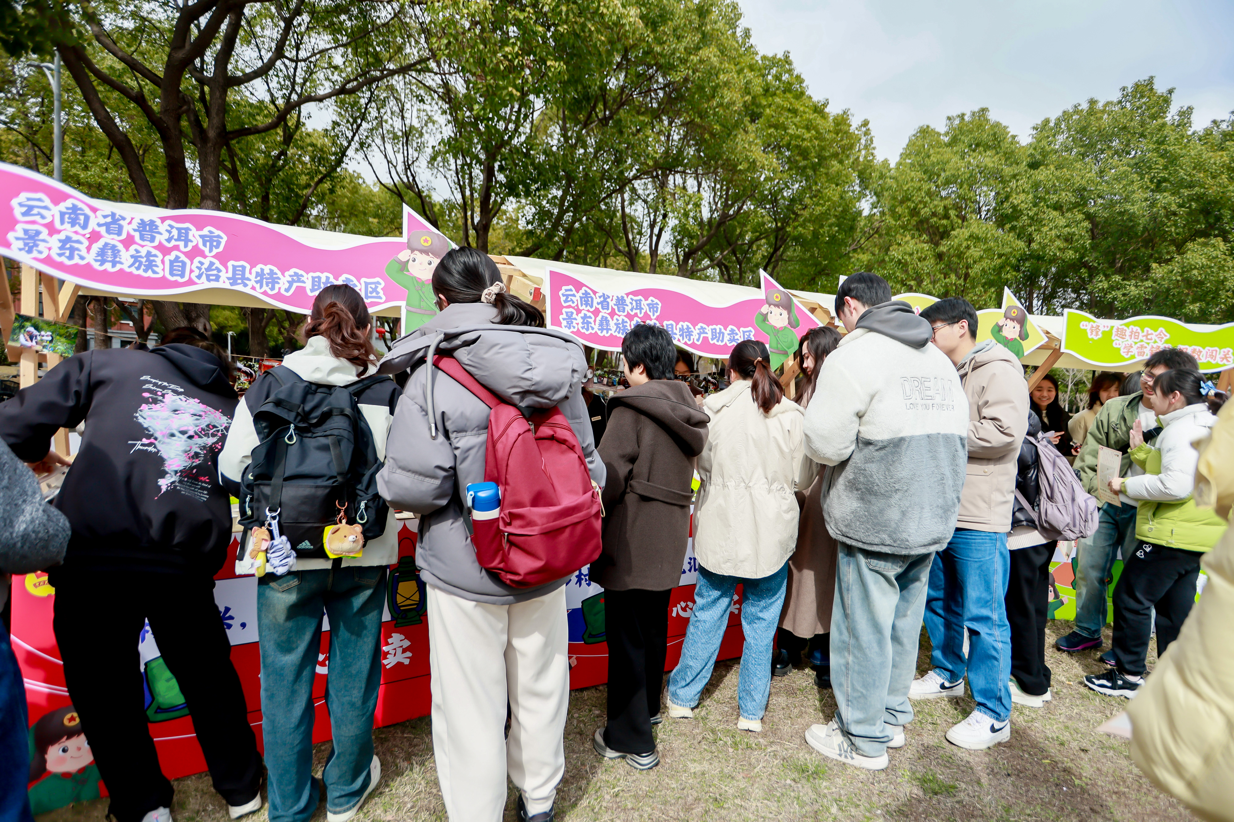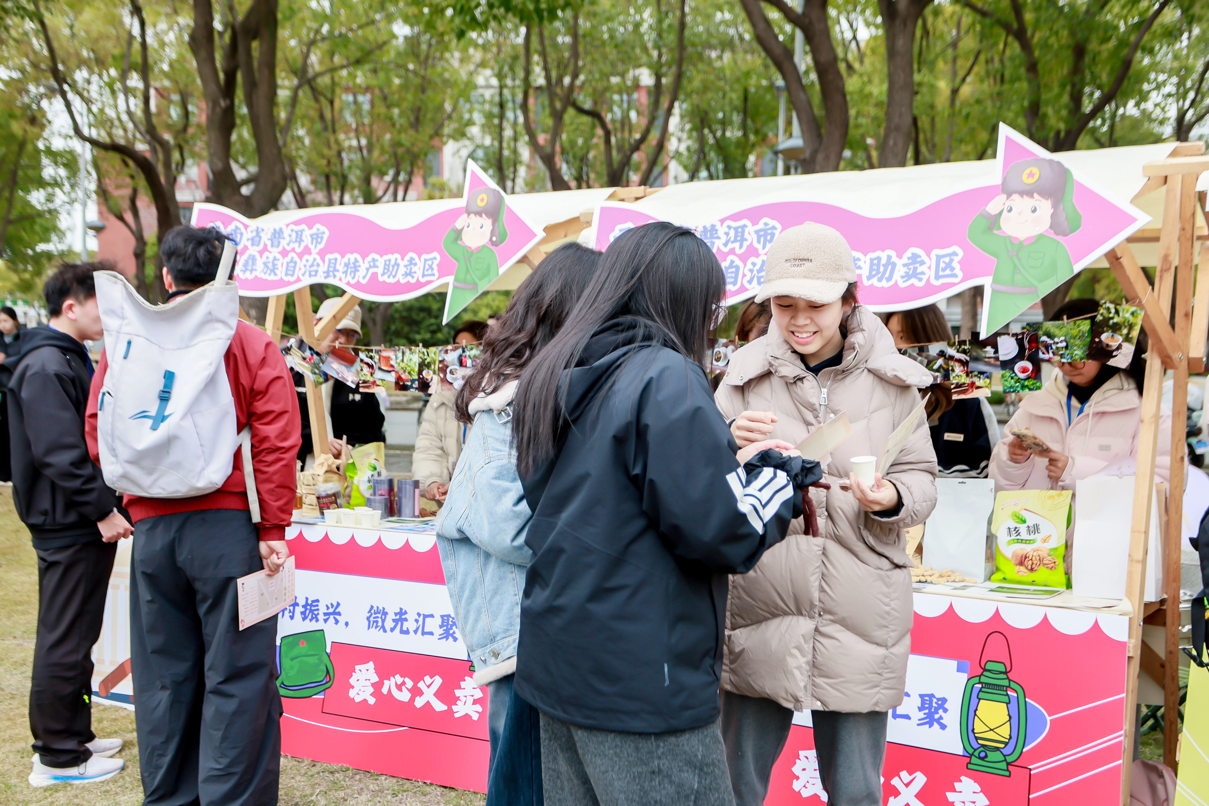爱心义卖区前,来自2700千米外云南省普洱市景东彝族自治县的山野特产格外亮眼,茶叶、核桃、花生、红糖、小黄饼等好物整齐摆放,这些均来自我校研究生支教团服务地,带着乡土的芬芳跨越山海来到华政园。师生们纷纷驻足选购,以消费助振兴、以义卖传爱心,让远山的耕耘有回响,让远方的努力被看见。小小的市集成为连接华政与景东的爱心桥梁,让雷锋精神在跨域帮扶中落地生根。