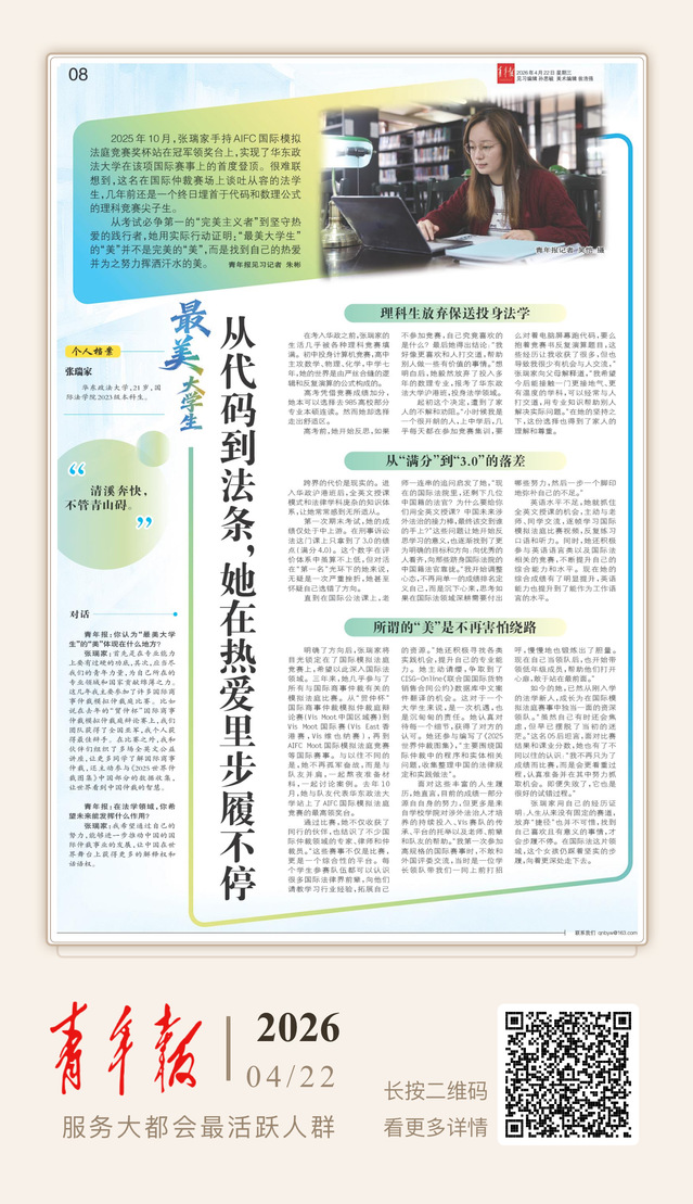 如今的她,已然转换角色,从刚入学的法学新人,摇身一变成长为在国际模拟法庭赛事中独当一面的资深领队。“虽然自己有时还会焦虑,但早已摆脱了当初的迷茫。”这位05后坦言,面对比赛结果和分数绩点,她也有了不同以往的认识:“成绩固然很重要,但我现在不再只为了成绩而比赛,而是会更看重过程,认真准备并在其中努力抓取机会。即便失败了,它也是很好的试错过程。”在她看来,比赛和学习的价值,已经远不止于成绩本身,而是难得的成长机会。她用自己的经历证明,最美大学生的“美”并不是完美的“美”,而是找到自己热爱并为之努力挥洒汗水的美。