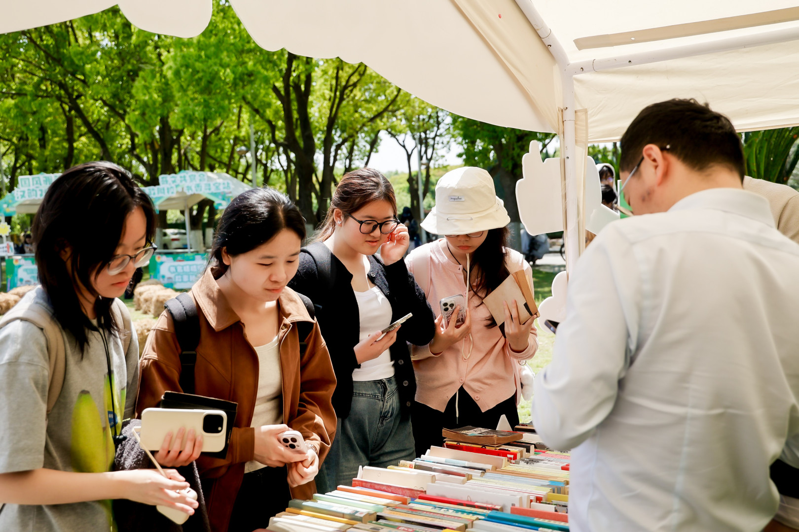 与此同时,“素纸文坊”书店市集重磅亮相,汇聚钟书阁、新华书店、西西弗书店、小朱书店四大知名书店品牌,带来涵盖文学、历史、法律、社科、青年成长等多个品类的优质图书和文创展销。师生们驻足翻阅、精心挑选。来自刑事法学的谢同学表示:“活动的每一处设计都让阅读变得可感、可触、可参与,也让我们更加热爱阅读、享受阅读。”